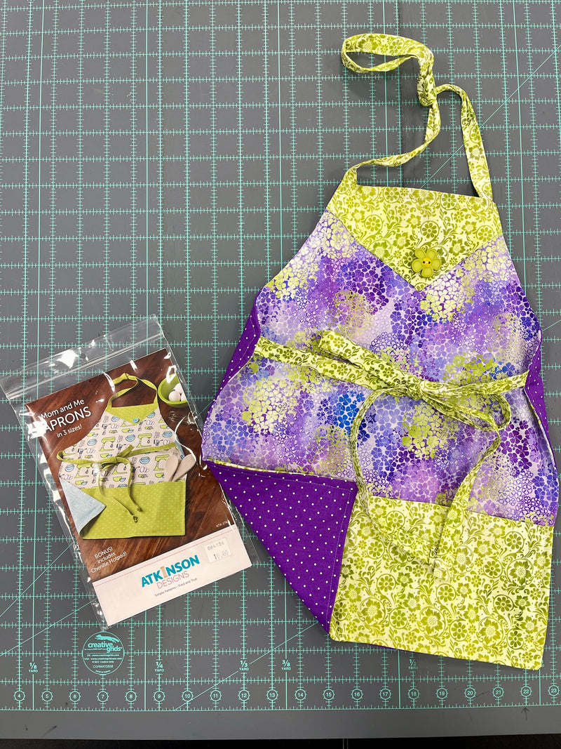 This weeks' project is Atkinson Designs Mom and Me Apron! Its available in 3 sizes - toddler, child, and adult. As a bonus it also includes Chenille Hotpad! This pattern is available at our Green Brook location. We made the toddler size and our apron features In the Beginning fabrics. We used Garden of Dreams II by Jason Yenter for the top two fabrics and a Tula Pink fabric for the back.