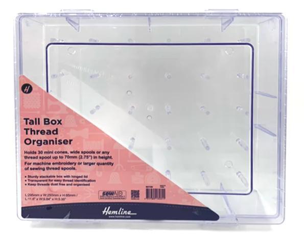 Organize your thread with this convenient, stackable 30 spool plastic thread box with hinge top for easy spool storage.