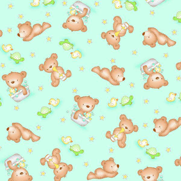 This fabric features teddy bears, rubber duckies, turtles, and stars on a green background.