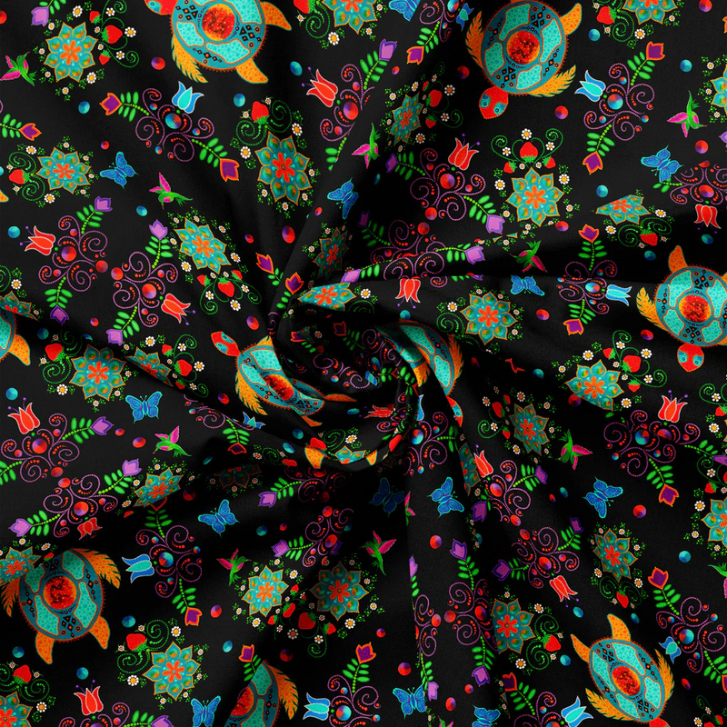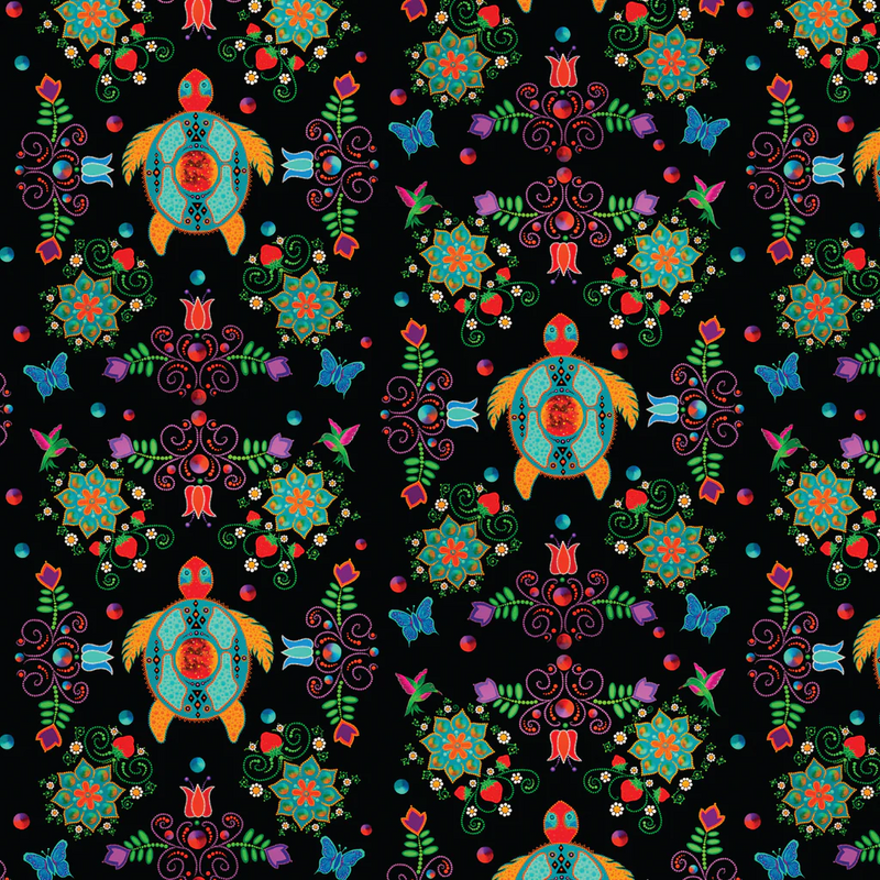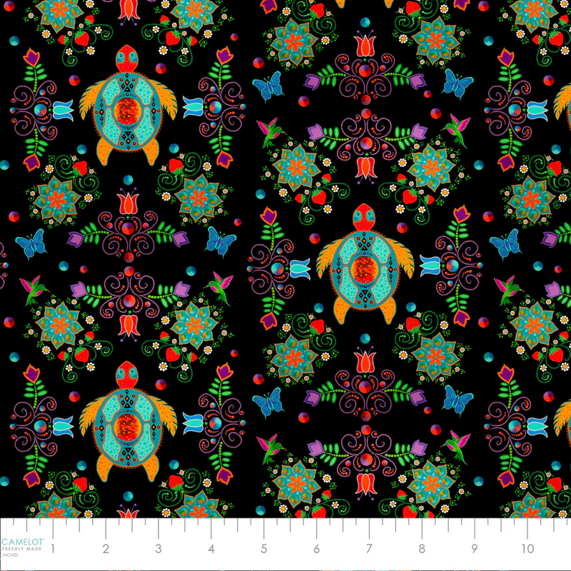 After the immense popularity of 'Rejuvenation', we teamed up again with Indigenous artist Tracey Metallic on her newest quilting cotton fabric collection, 'Truth'. Bursting to life with turtles, hummingbirds, butterflies, strawberries, florals, this collection encompasses traditional beliefs and imagery with eye-catching colours and beautiful stylized artwork. Great for heirloom quilts, wall hangings, apparel and room decor.
