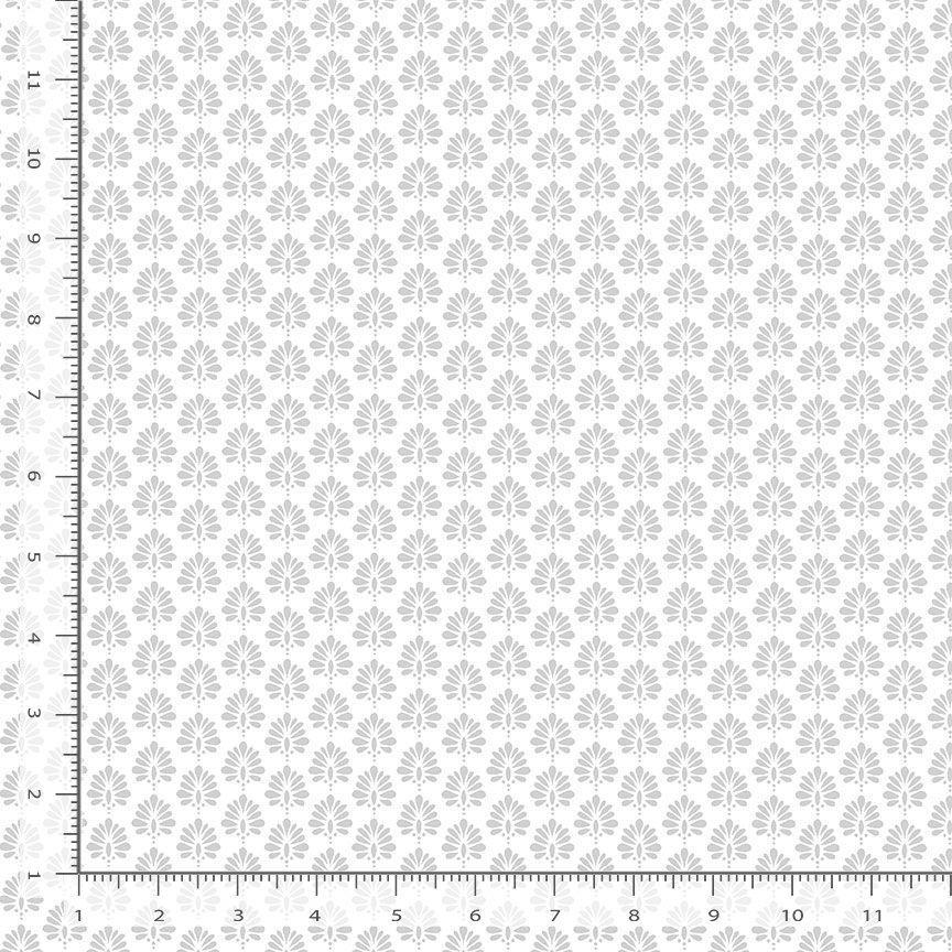 This Fabric is a tone on tone white print on a slightly darker ivory background. The pattern is reminiscent of classic scalloped wallpaper.
